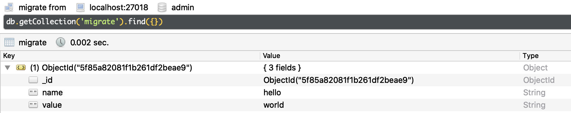 db.migrate.insertOne({name: 'hello', value: 'world'})此时可在 Mongo 客户端中进行查看数据操作:
